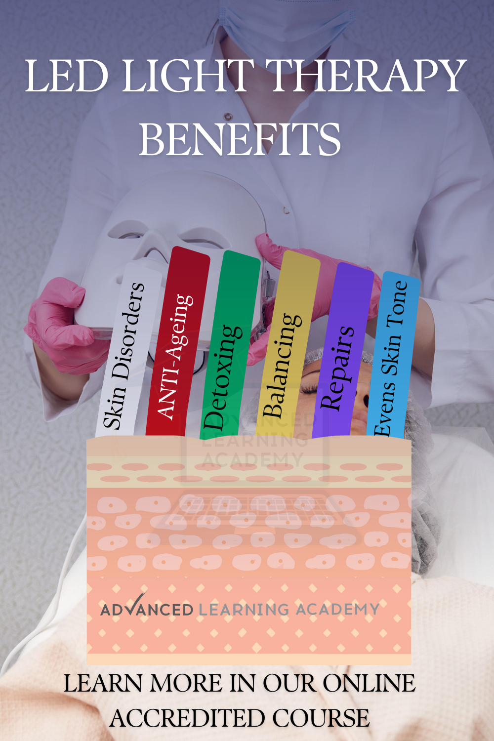 In our Advanced Learning Academy accredited online LED Light Therapy course, practitioners learn how different light wavelengths interact with the skin — and how to apply them safely and effectively in treatment settings. In this blog, we explore some of the key benefits highlighted in the image.from LED light therapy.